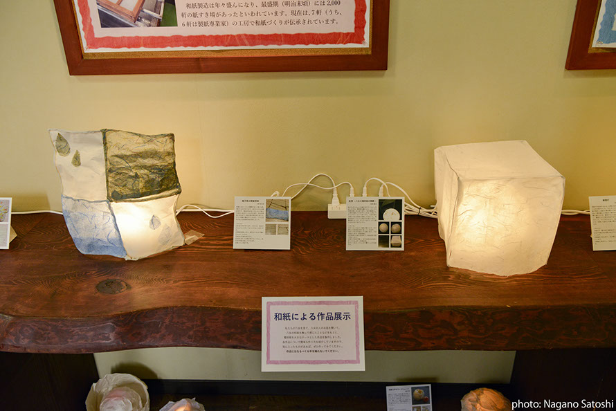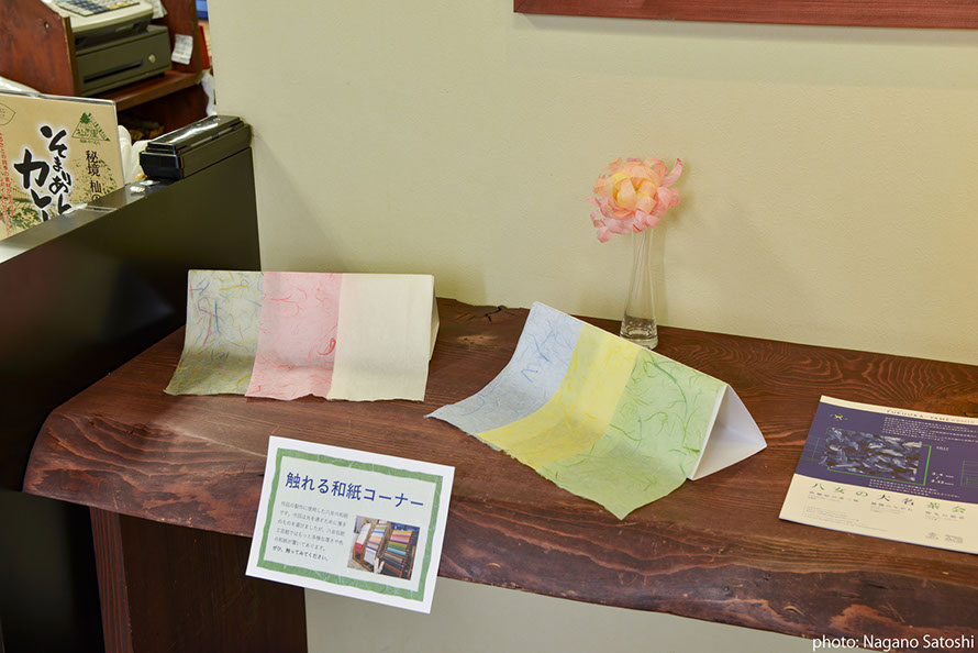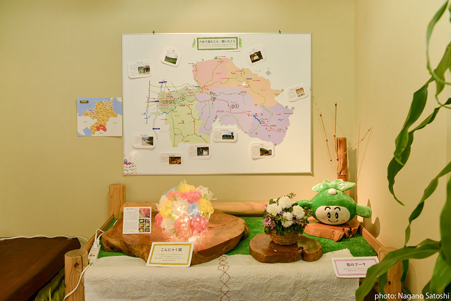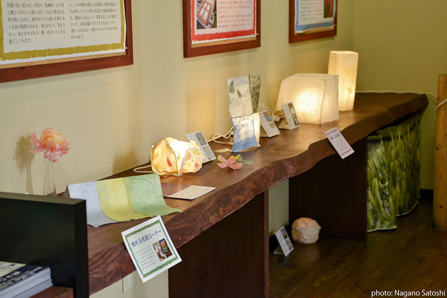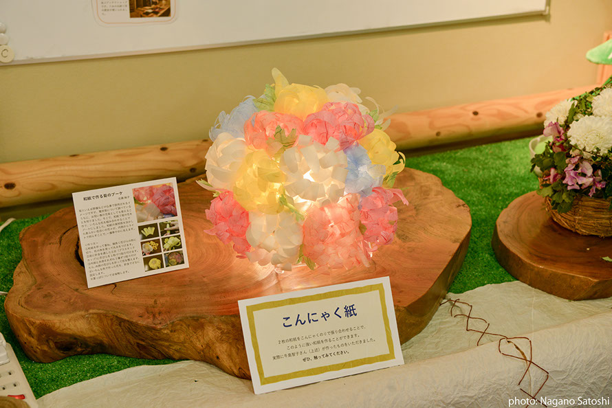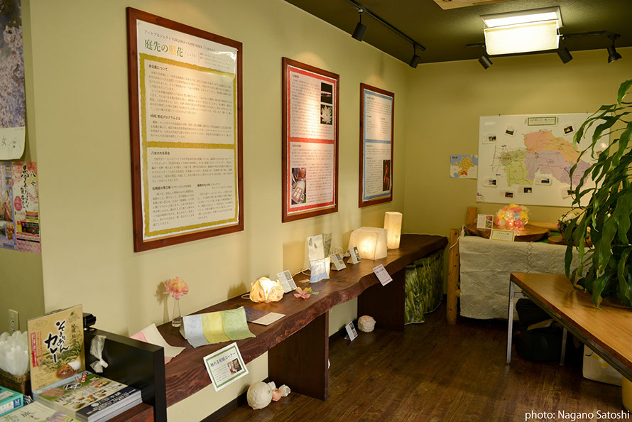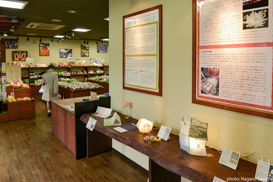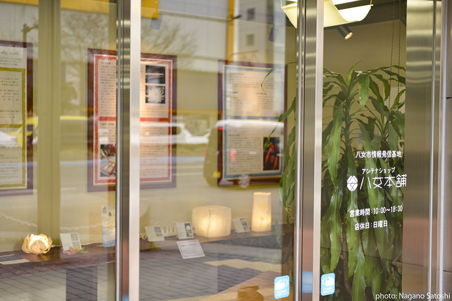 HME育成プログラムの大学院生が、「八女の再発見」をコンセプトとし、電照菊と和紙に着目した展示を行いました。八女本舗は福岡市の中心部天神にある、八女の物産を扱うアンテナショップです。天神のまちなかで里山の空気を感じられるよう、展示と合わせて、八女の音(自然音、茶摘み歌、茶工場の機械音)と都市の環境音をコラージュ/ 再構築したMix 音源(制作:DJ MASUO)が流れる空間をつくりました。