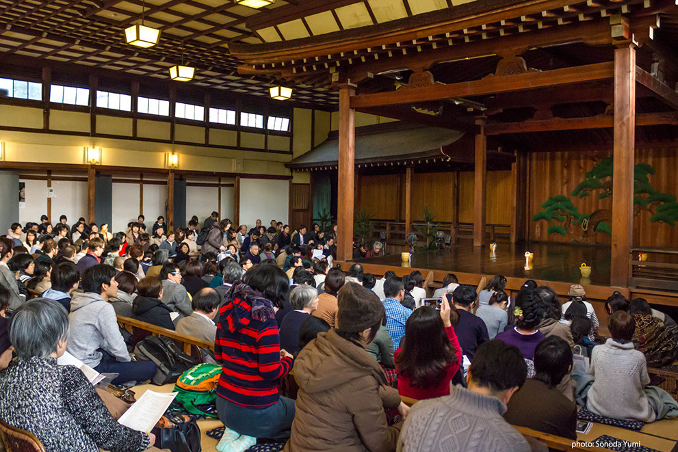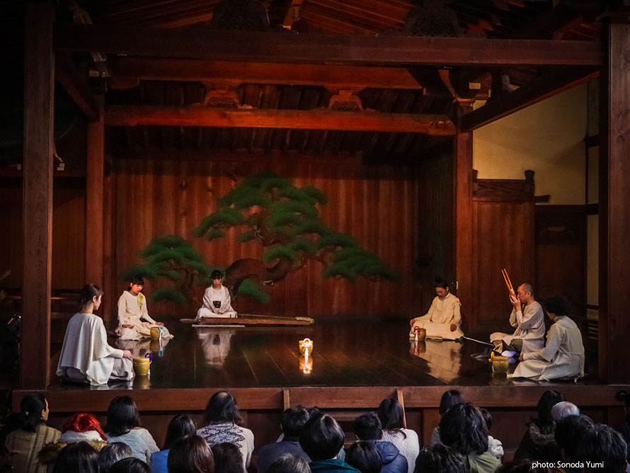 ソーシャルアートラボでは、地域資源の発掘と新たな発信方法の提案にも力を入れています。今年度は、九州の象徴とも言える焼酎の醗酵音響を素材とした神楽の創作上演を行いました。現代神楽「甕の音なひ」は、焼酎、そして焼酎を取り巻く文化を、テクノロジーとアートによってとらえ直し、新たな発信力を持たせる斬新な試みです。公演は、博多住吉神社の能楽殿で行われました。