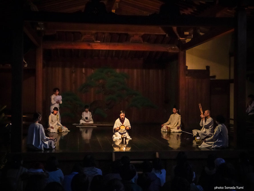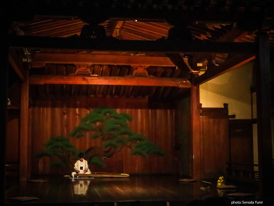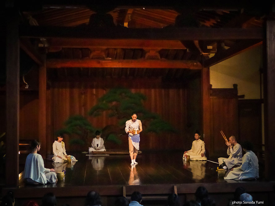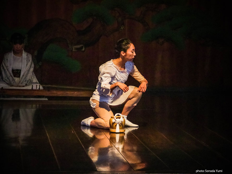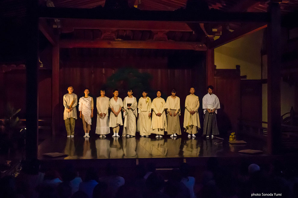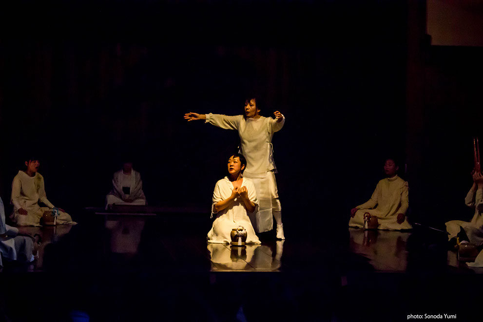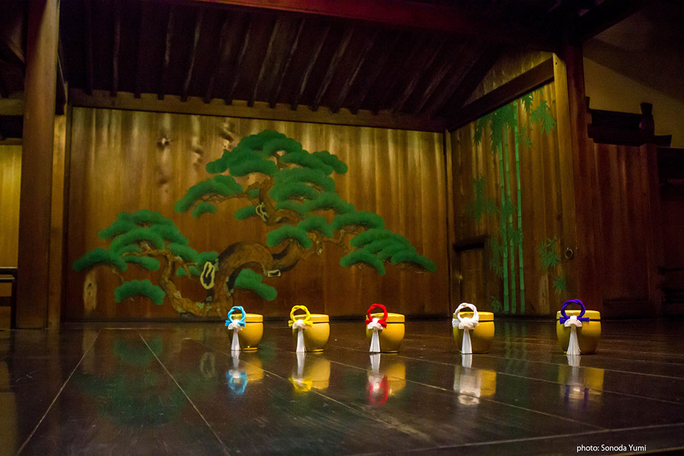 舞台には五つの甕が登場し、五色の水引がそれぞれに結ばれています。甕の中で古来より響いてきた焼酎醗酵の音、神話、伝統的な和楽器が奏でる神遊びの音楽、コンテンポラリーダンサーと舞踏家が奉納する舞、そして生命の証である呼吸が生み出す自然な声、これらすべての要素が能舞台に流れる悠久の時間の中で一つに結ばれ、調和した世界が創成されました。これは、九州の地に根付く文化と、芸術工学研究院のアート、テクノロジーの協演によって、これまで人が聞くことのなかった小さな生命の営みに耳を澄まし、その神秘を体感する21世紀の神楽です。