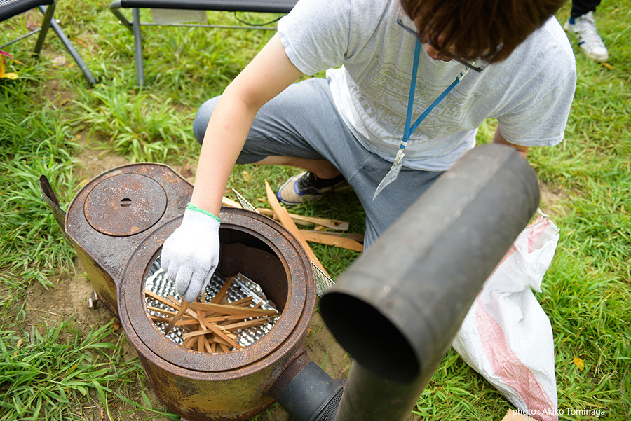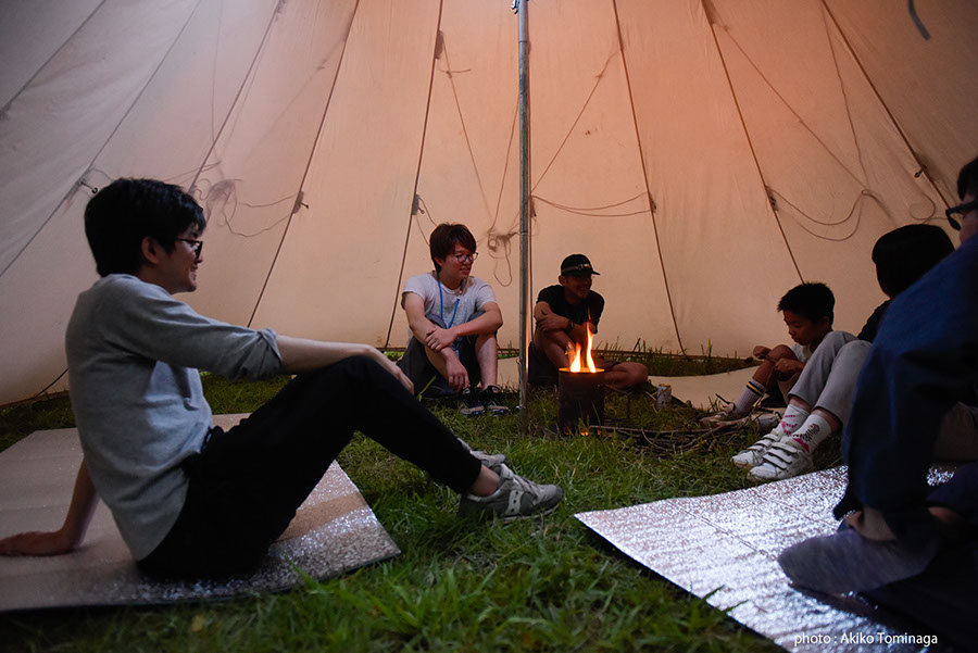 2日目は、SALのアーティスト、ジェームズ・ジャックさんによるワークショップで土への感覚を新たにした後、午後は小山田さんの焚き火ワークショップ。共に準備することで生まれる連帯感、火を囲むことで生まれる親密さは、日が落ちてあたりが暗くなるにつれて一段と強まっていきました。