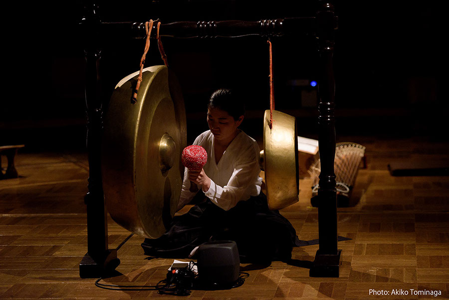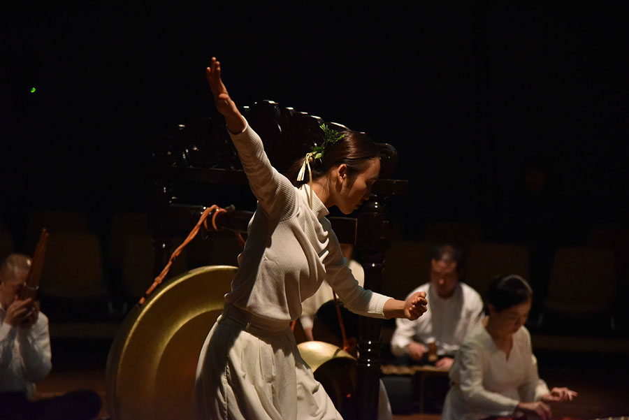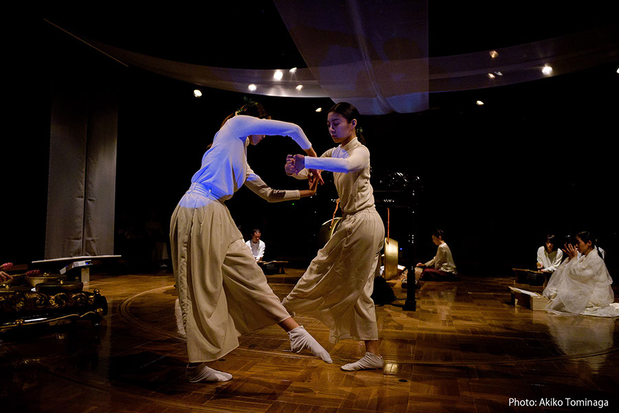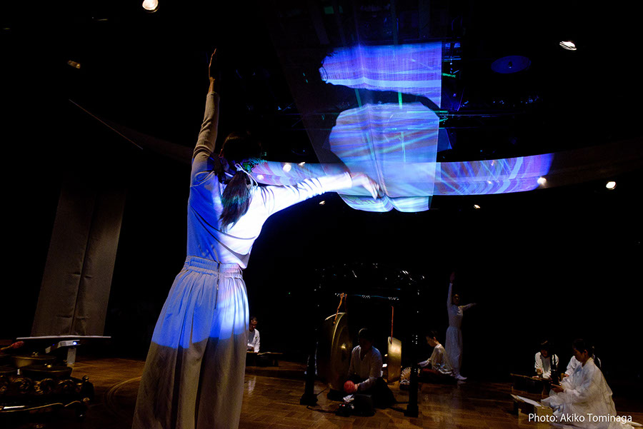 織匠の宮嶋美紀さんの機音が円形ホールに響き、ペ・ヨンジンさんが銅鑼で作り出す呼吸に合わせて、笙や箏、ガムランの音色が厳かな空間を作り上げていきました。そして、織りの時間を可視化するように、二人の舞手、有泉汐織さんと杉本音音さんがシンプルな動作の反復で、美しい軌跡を描いてきました。天井に吊られた布には、ところどころ織機の機構が映し出され、音とあいまって瞑想的な時空間が現れました。